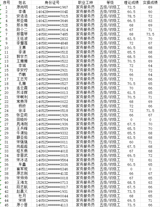 晉城市潔霸清潔服務(wù)股份有限公司職業(yè)技能等級(jí)認(rèn)定中心2024年9月28日第40批家政服務(wù)員初級(jí)認(rèn)定人員成績(jī)公示