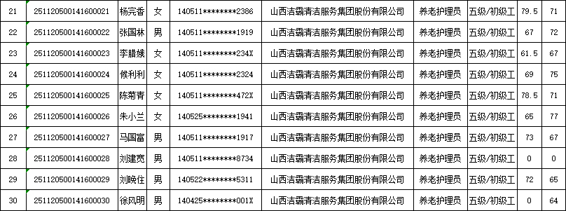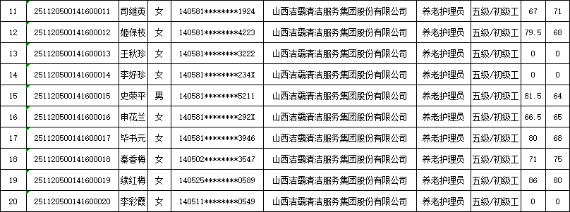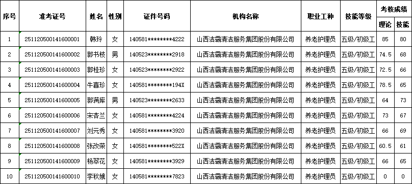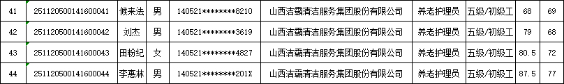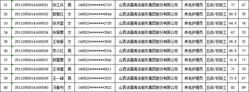 山西潔霸清潔服務(wù)集團(tuán)股份有限公司職業(yè)技能等級(jí)認(rèn)定中心2025年11月22日第4批養(yǎng)老護(hù)理員初級(jí)認(rèn)定人員成績(jī)公示